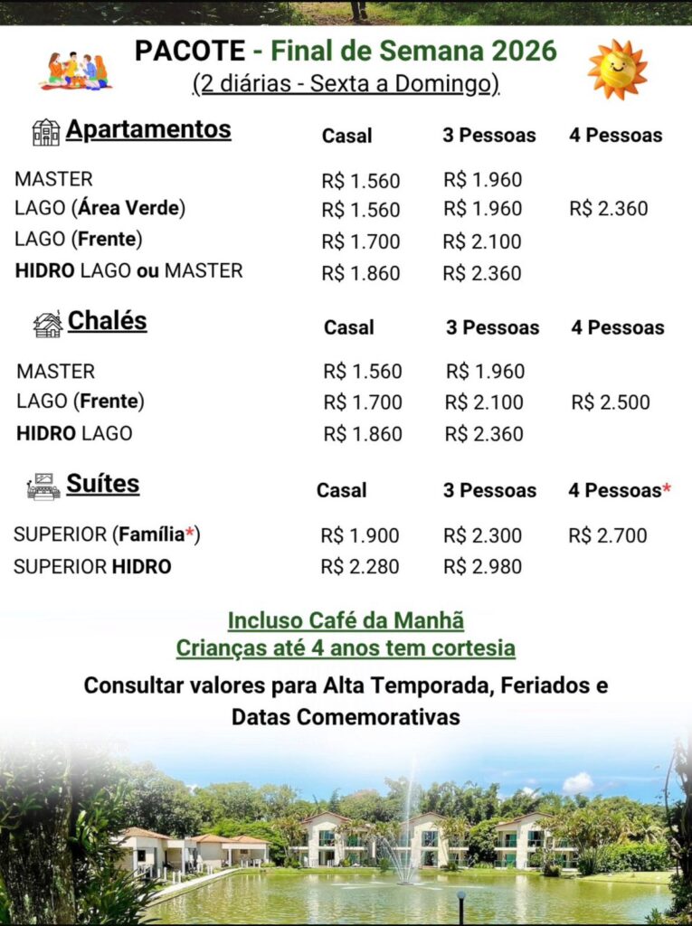 Válidas para o fim de semana (2 diárias) | Sexta a domingo / Sábado a segunda