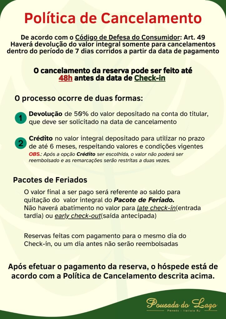 O cancelamento da reserva pode ser efetuado com o prazo de até 48 HORAS antes da data do Check-In.